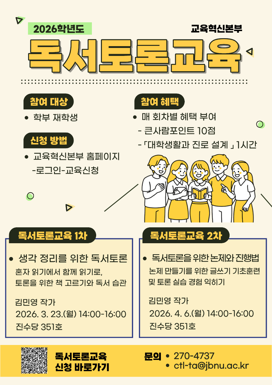국립대육성사업의 일환으로 학생들의 비판적 사고력 및 의사소통 능력 향상을 위한「2026학년도 독서토론교육」을 다음과 같이 진행하오니, 관심 있는 학생들의 참여를 바랍니다.